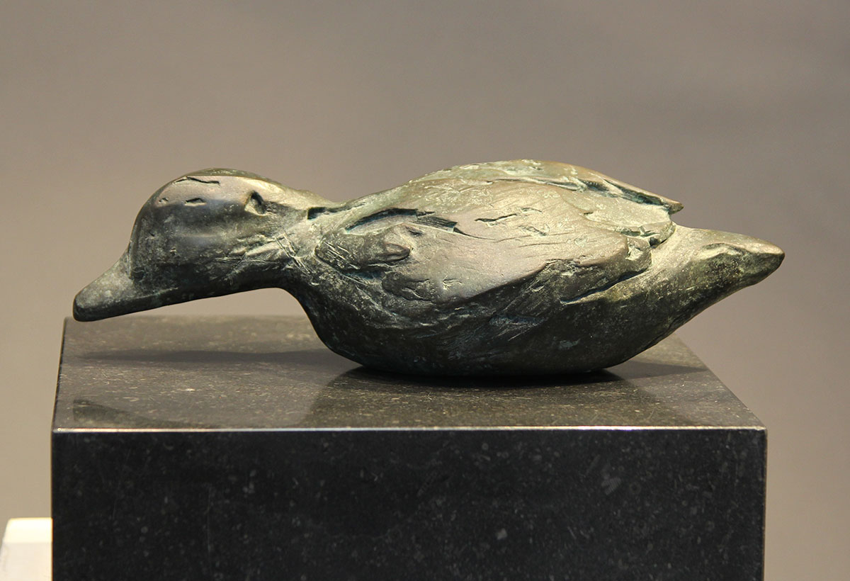 The bronze ducks are freestanding, faceted, and tactile. They are about human susceptibility and symbolise love in the tradition of Feng Shui. Arranged as I intended them originally to sit, with dark, polished Belgian Fossil stone they will also work well nose to nose on a window sill, shelf or table and in a variety of other ways too. Although in principle an edition of 9, each pair is unique as they are all hand finished by me in the bronze. The patination varies with each pair. They can be enlarged to any size and material. This would form a new limited edition. At Bowman Sculpture 13th-18th February 2023.